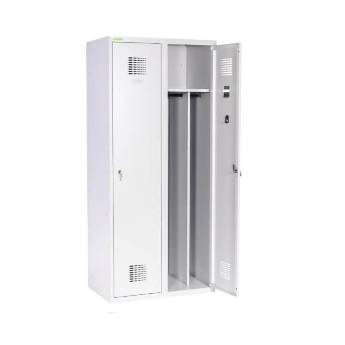 2-dverová kovová šatňová skriňa s dlhými dvierkami a deliacou prepážkou sa môže využiť na oddelenie pracovného a civilného oblečenia v jednej skrini. Hodí sa do šatne v škole, firme či športovom zariadení. Konštrukcia skrine je zváraná z kvalitného oceľového plechu 1. triedy s povrchovou úpravou. Pohodlne si v nej uskladníte oblečenie a oceníte efektívne prúdenie vzduchu vďaka otvorom v hornej aj dolnej časti dverí.