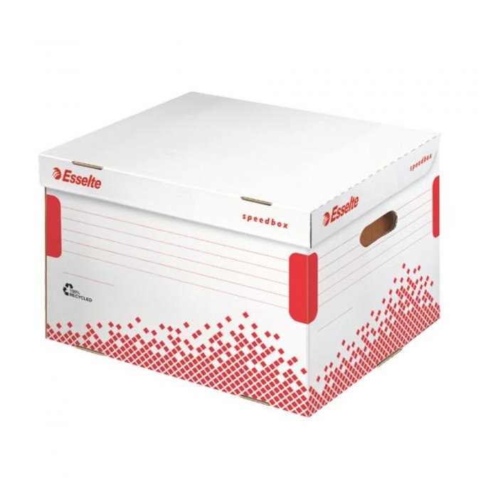Archívne krabice so sklápacím vekom z archivačného systému Speedbox. Spevnené steny aj dno pre maximálnu pevnosť a odolnosť pri stohovaní. Ideálne na prenos dokumentov alebo rôznych predmetov. Vyrobené zo 100% recyklovanej vlnitej lepenky. Farba biela/ červená. Rozmery 392 × 301 × 334 mm. Kapacita 5 zakladačov šírky chrbta 75 mm. Väčšie balenie 15 kusov.