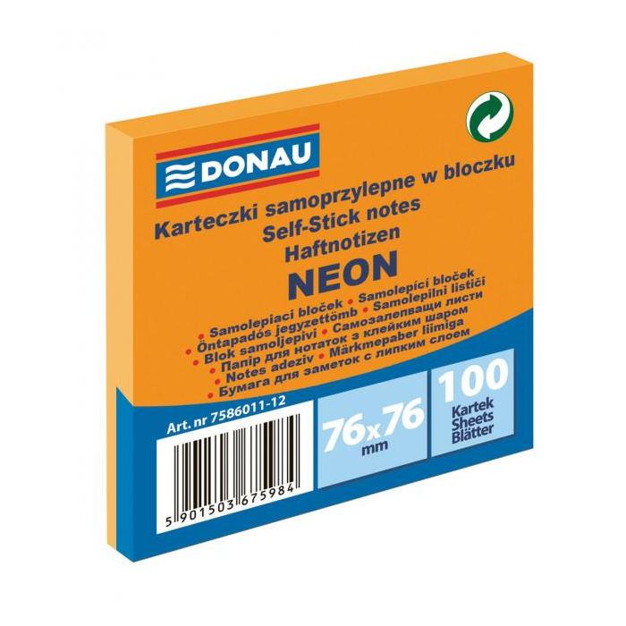Bloček Donau, 76 x 76 mm, neónová oranžová, 100 lístkov