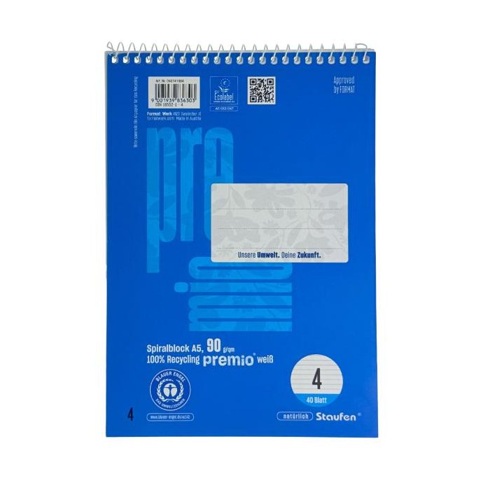 Kvalita s ekologickým doplnkom! Exkluzívny rad premio® je vyrobený zo 100 % recyklovaného papiera podľa prísnych požiadaviek Blue Angel a EU Ecolabel. Prvotriedna kvalita a žiarivo biely 90 gramový papier zaisťujú príjemný pocit pri písaní a vynikajúcu nepriehľadnosť.