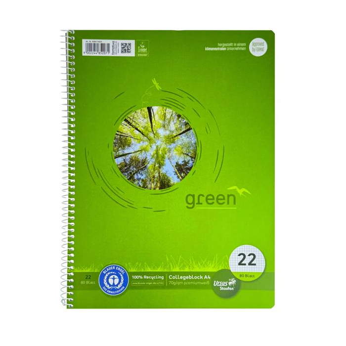 Ursus® Green - krúžkový blok so špirálou na boku vyrobený z vysoko kvalitného písacieho papiera s hmotnosťou 70 g / m2. 100%, papier vyrobený výlučne z recyklovaných vlákien