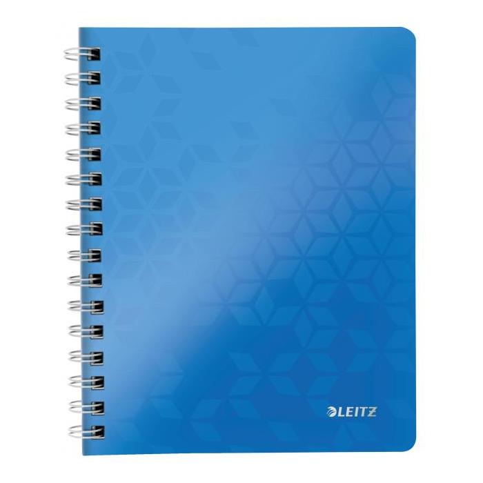 Krúžkový blok z dizajnovej rady Leitz WOW formátu A5 v žiarivých farbách. Vo vnútri biely papier s hmotnosťou 80 g / m2 s FSC® certifikáciou. Stránky sú perforované pre ľahšie odtrhávanie jednotlivých listov. Dvojitá drôtená krúžková väzba uľahčuje pretáčanie listov a zaisťuje dlhú životnosť bloku. Blok s pružnými doskami z polypropylénu obsahuje odnímateľné pravítko a vnútorné vrecko na uloženie voľných papierov, Väčšie balenie 6 ks. Farba metalická modrá.