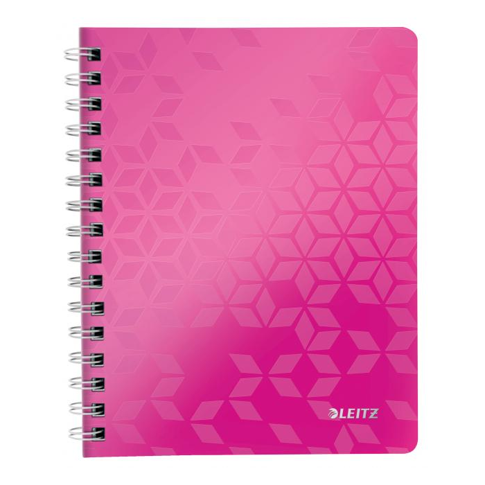 Krúžkový blok z dizajnovej rady Leitz WOW formátu A5 v žiarivých farbách. Vo vnútri biely papier s hmotnosťou 80 g / m2 s FSC® certifikáciou. Stránky sú perforované pre ľahšie odtrhávanie jednotlivých listov. Dvojitá drôtená krúžková väzba uľahčuje pretáčanie listov a zaisťuje dlhú životnosť bloku. Blok s pružnými doskami z polypropylénu obsahuje odnímateľné pravítko a vnútorné vrecko na uloženie voľných papierov, Väčšie balenie 6 ks. Farba metalická ružová. Úprava: linajková Počet listov: 80