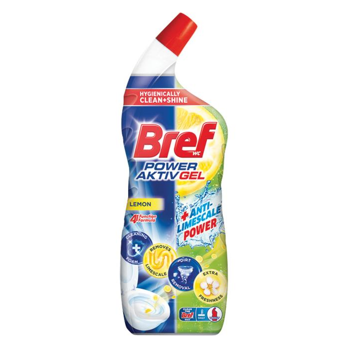 Bref WC gél účinne odstraňuje škvrny, vodný kameň a pomáha udržiavať hygienickú čistotu a sviežosť. Praktický dávkovač dosiahne aj pod okraj misy a odstráni škvrny a vodný kameň. Objem 700 ml. Vôňa Lemon.