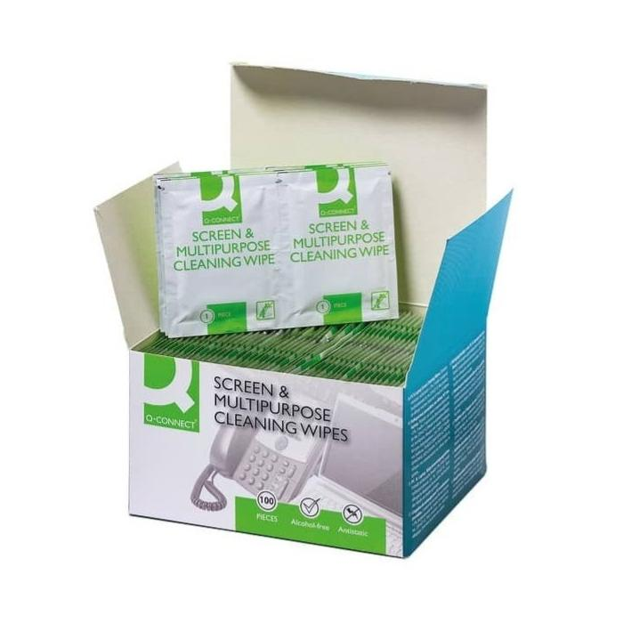 Čistiace utierky na čistenie telefónov a pevných povrchov z plastu, ako sú kryty a povrchy tlačiarní, telefónov a kancelárskeho vybavenia. Jednotlivo balené utierky.
