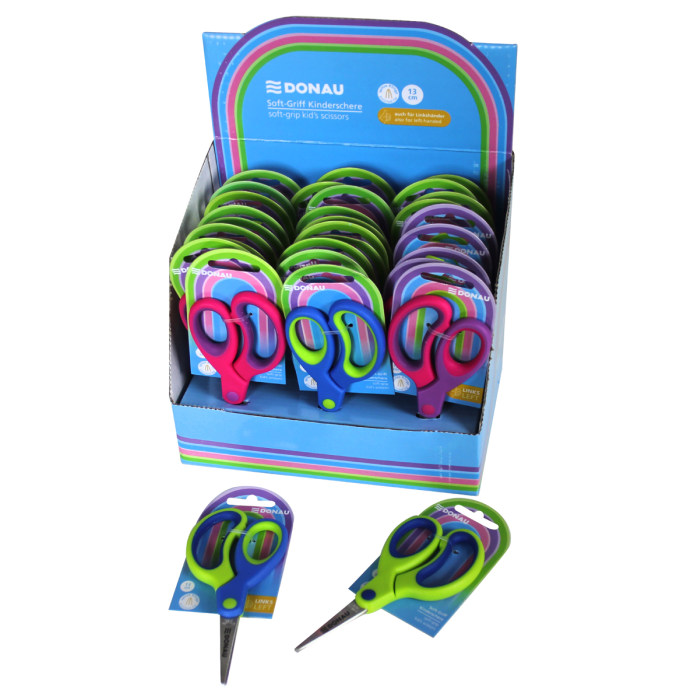 Detské nožnice s mäkkou rukoväťou, ostrá čepeľ, prakticky nezničiteľné, 13 cm (5 palcov), 5-ročná záruka. Dostupné v 4 farbách, 6 kusov pre pravákov (ružová, fialová, zelená, modrá) a 6 kusov pre ľavákov s dvojfarebnými rukoväťami (ružová/fialová a zelená/modrá). Jednotlivo balené v blistroch s otvormi v európskom štýle a 30 kusov v displeji.
