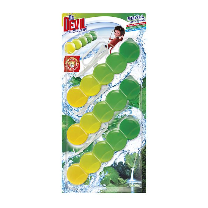 5BALL COMPLETE EFFECT je osviežovač vzduchu a toaletný blok 2v1 pre kompletnú starostlivosť o Vašu toaletu. V horných komorách je gélový osviežovač vzduchu, ktorý sa nevymýva a trvalo vonia po celú dobu pôsobenia dolných komôr, ktoré čistia, penia a preventívne pôsobia proti usadzovaniu vodného kameňa.