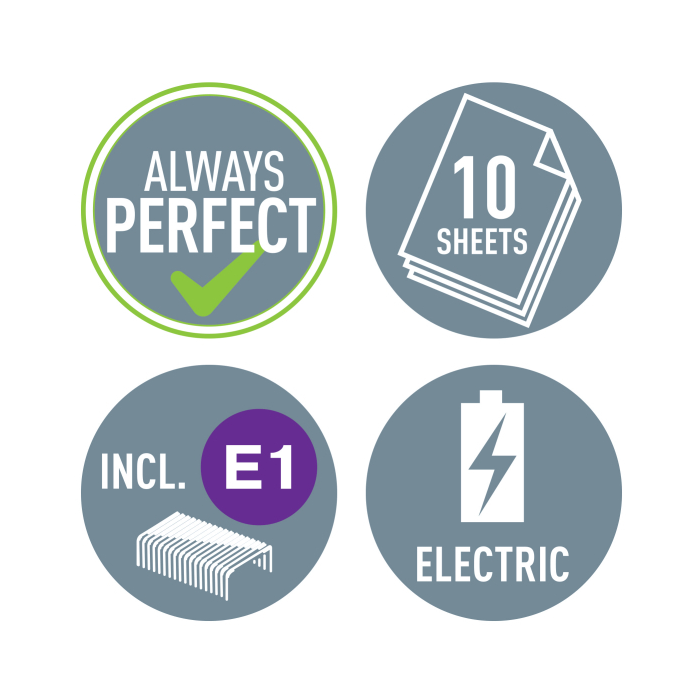 Technológia s napájaním na batérie na zošívanie v pohybe. V žiarivých farbách WOW. Batérie (4× 1,5 V AAA LR03) nie sú súčasťou balenia. Kapacita 10 listov. Náhradné spinky ES556800. Farba ľadovo modrá.