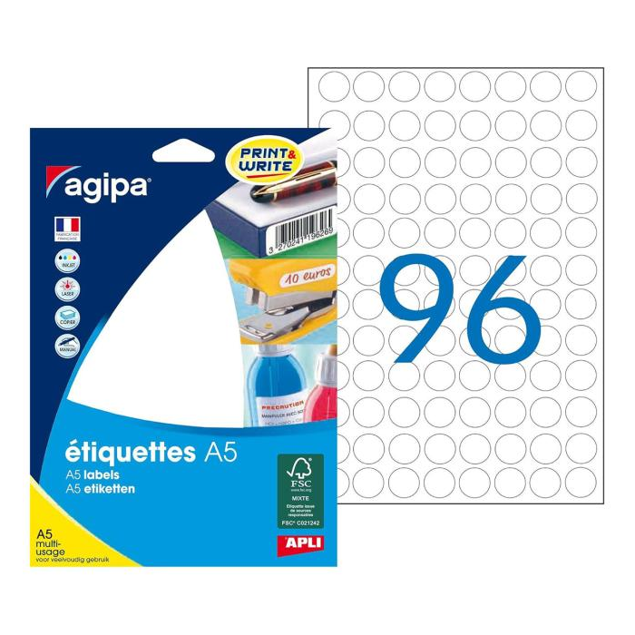 Etikety kruhové 15mm Agipa A5 biele