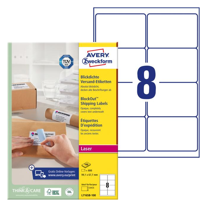 Biele etikety vhodné ako prepravné štítky na zásielky. Vďaka inovatívnej technológii ultragrip sa môžete spoľahnúť na bezchybné natiahnutie archu a tlač bez zasekávania. Bezpečnostný okraj QCT zabraňuje zanášaniu tlačiarne lepidlom. Rýchla technológia QuickPEEL™ zabezpečí, že etiketu odlepíte z podkladového papiera za sekundu. Šablóny a softvér pre jednoduchú a rýchlu tlač etikiet sú k dispozícii zdarma na www.avery-zweckform.cz/software/avery-design-print. Sú vhodné pre všetky štandardné laserové tlačiarne. Pre laserové tlačiarne testované a certifikované TÜV SÜD. Rozmer 99,1 x 67,7 mm. Balenie 100 hárkov.