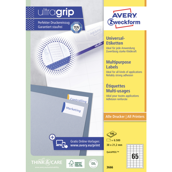 Biele univerzálne etikety vhodné na každodenné použitie v atramentových a laserových tlačiarňach a kopírovacích strojoch. Vďaka inovatívnej technológie ultragrip sa môžete spoľahnúť na bezchybné natiahnutie archu a tlač bez zasekávania. Bezpečnostný okraj QCT zabraňuje zanášaniu tlačiarne lepidlom. Pre laserové tlačiarne testované a certifi kované TÜV SÜD. Vysoká lepivosť na rôznych povrchoch. Ostrá tlač bez bez rozmazávania. Etikety sú vyrobené spôsobom šetrným k životnému prostrediu, majú certifi káciu FSC®, sú bielené bez použitia chlóru. Šablóny a softvér pre jednoduchú a rýchlu tlač etikiet k dispozícii zdarma. U niektorých rozmerov systém QuickPEEL™ na rýchlejšie odlepenie etikiet. Formát A4. Balenie 100 hárkov. Farba biela.