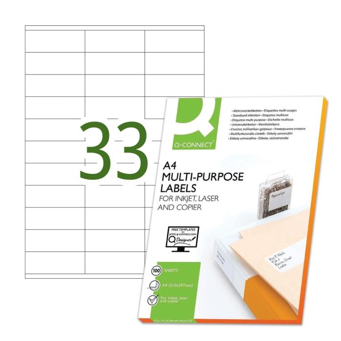 Univerzálne samolepiace etikety pre laserové a atramentové tlačiarne a kopírovacie zariadenia. Formát A4. Farba biela. Balenie 100 hárkov. Etikety na hárku 33 ks.