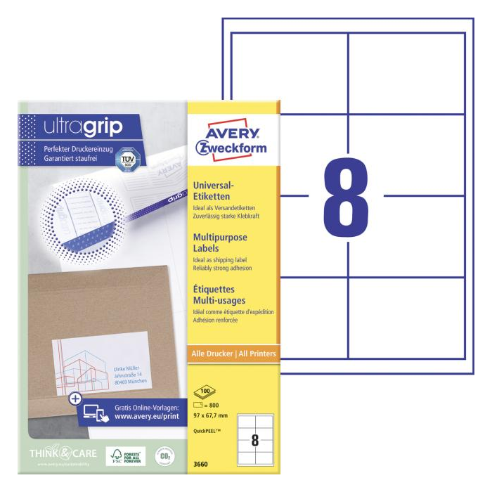 Biele univerzálne etikety vhodné na každodenné použitie v atramentových a laserových tlačiarňach a kopírovacích strojoch. Vďaka inovatívnej technológie ultragrip sa môžete spoľahnúť na bezchybné natiahnutie archu a tlač bez zasekávania. Bezpečnostný okraj QCT zabraňuje zanášaniu tlačiarne lepidlom. Pre laserové tlačiarne testované a certifikované TÜV SÜD. Vysoká lepivosť na rôznych povrchoch. Ostrá tlač bez bez rozmazávania. Etikety sú vyrobené spôsobom šetrným k životnému prostrediu, majú certifi káciu FSC®, sú bielené bez použitia chlóru. Šablóny a softvér pre jednoduchú a rýchlu tlač etikiet k dispozícii zdarma. Formát A4. Balenie 100 hárkov.