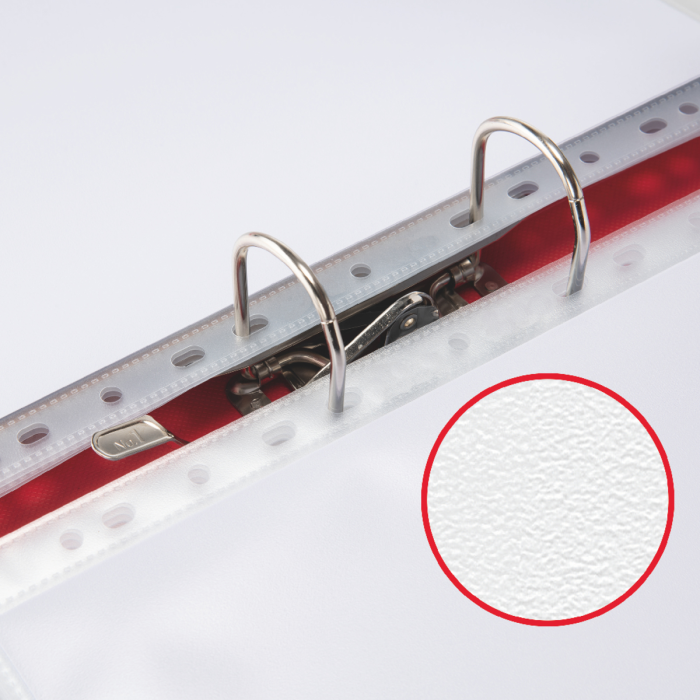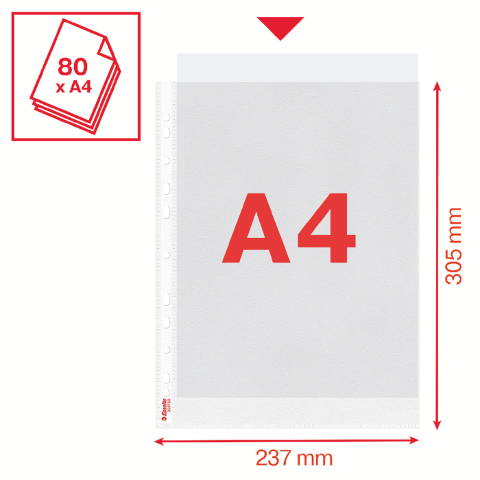 Pevné plastové závesné dosky rozšíreného formátu A4 na väčšiu kapacitu, než majú bežné závesné dosky. Povrch matný, otvor zhora. Hrúbka 100 mic. Vnútorné rozmery obalu 304 × 220 mm. Embosovaná PP fólia hrúbky 0,1 mm. Balenie 25 ks v PE sáčku.