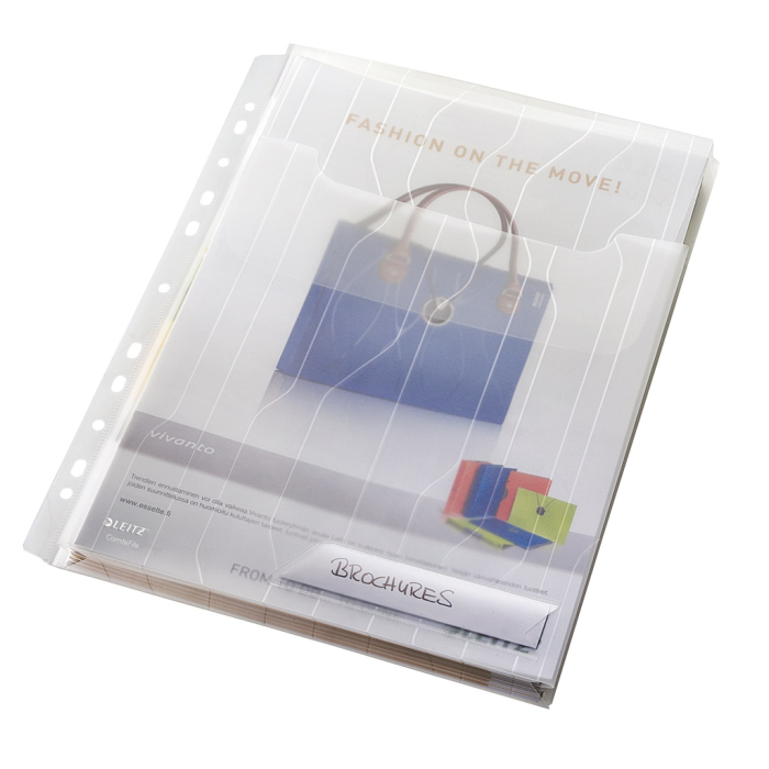 Závesný obal na katalógy a obsiahlejšie dokumenty, ktorý kombinuje vlastnosti euroobalov a obalov vďaka patentovanej skrývateľnej multiperforácii do špeciálneho puzdra. Vyrobený z kvalitného priehľadného PP s embosovaným vzorom. Hrúbka 200 um. Kapacita 150 listov papiera formátu A4. Balenie 3 ks. Farba: priehľadná