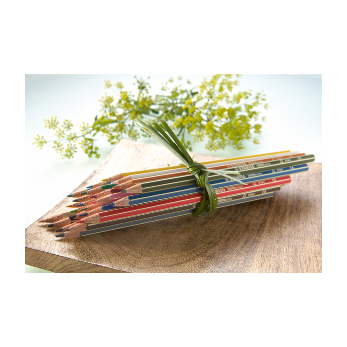 Farbičky STABILO GREENcolors sú vyrobené zo 100% certifikovaného dreva s certifikátom FSC® (Forest Stewardship Council) pochádzajúceho z udržateľných lesov. Kvalitné tuhy s priemerom 3 mm. Klasický šesťhranný tvar s matným lakovaním. Intenzívne žiarivé farby. Sada 12 ks.