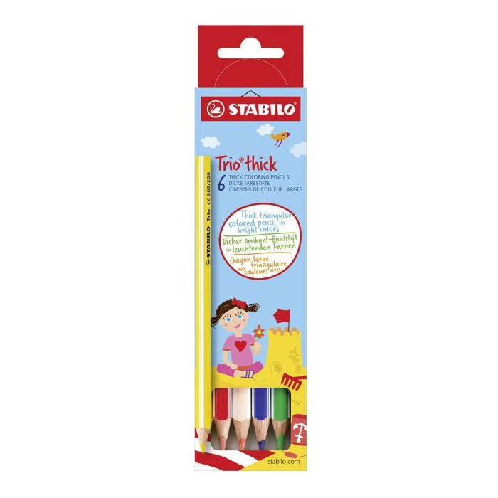 Trojhranné farbičky Trio majú ergonomický tvar pre pohodlné a uvoľnené držanie. Doporučený rozmer pre školákov 1. stupňa. Intenzívne farby, nelámavé tuhy. Priemer tuhy 4,2 mm. Balenie 6 farieb.