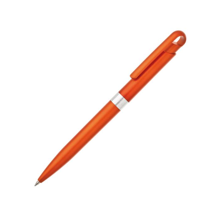 Plastové guľôčkové pero FIROL v metalických farbách. Uprostred pera je stieborný krúžok. Modrá náplň veľkoobjemová. Kolekcia DESIGN. Farba oranžová.