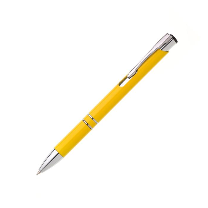 Plastové guľôčkové pero OIRA s kovovými doplnkami. Modrá náplň veľkoobjemová. Farba žltá.