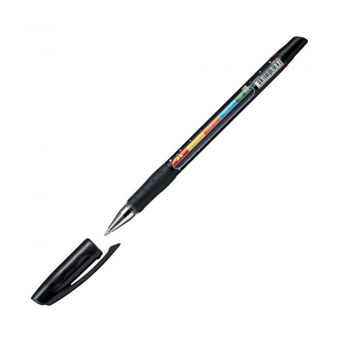 Plastové guľôčkové pero s priehľadom s ukazovateľom hladiny zostávajúceho atramentu, resp. počtu strán, ktoré je možné ešte napísať. Vhodné najmä pre školákov a študentov pri skúškach a testoch. Elastická úchytová zóna pre uvoľnené držanie, ľahko tečúci atrament pre rýchle a čisté písmo. Šírka stopy 0,45 mm. Väčšie balenie 10 ks.