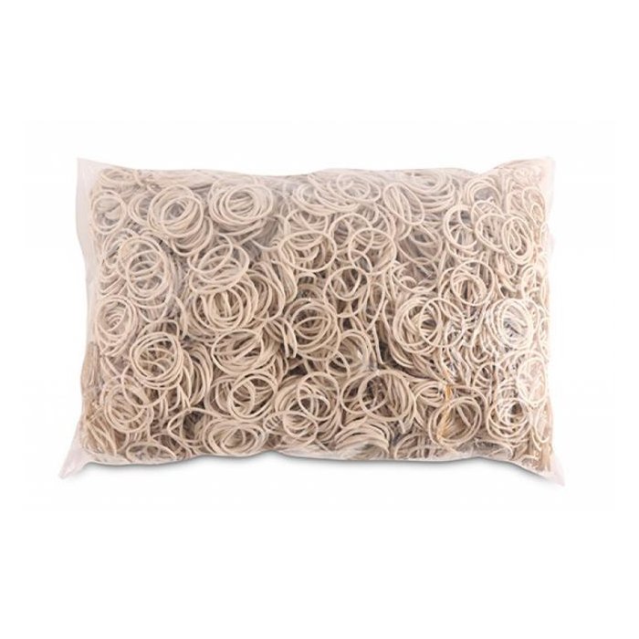 Odolné a pružné gumičky vyrobené z materiálu s prímesou gumy (60 %). Rozmery (hrúbka × šírka) 1,5 × 1,5 mm. Priemer 25 mm. Farba biela.