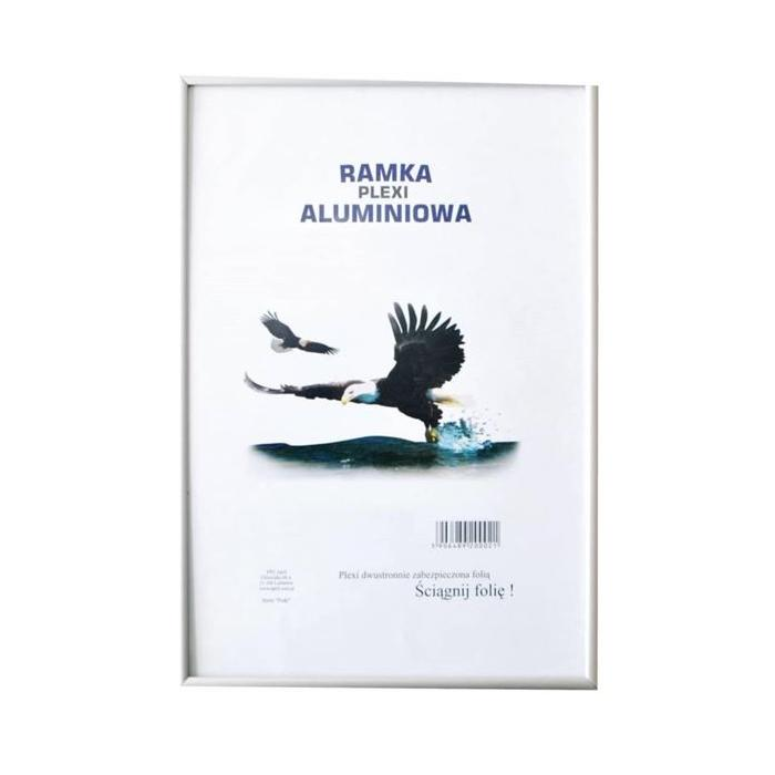 Rámček vyyrobený z odolného hliníka, má priehľadné plastové predné sklo. Zadná strana z HDF drevenej dosky. Rozskrutkovanteľné rohy v zadnej časti. Priložený háčik na zavesenie. Rozmer: 210 x 297 mm. Farba strieborná.