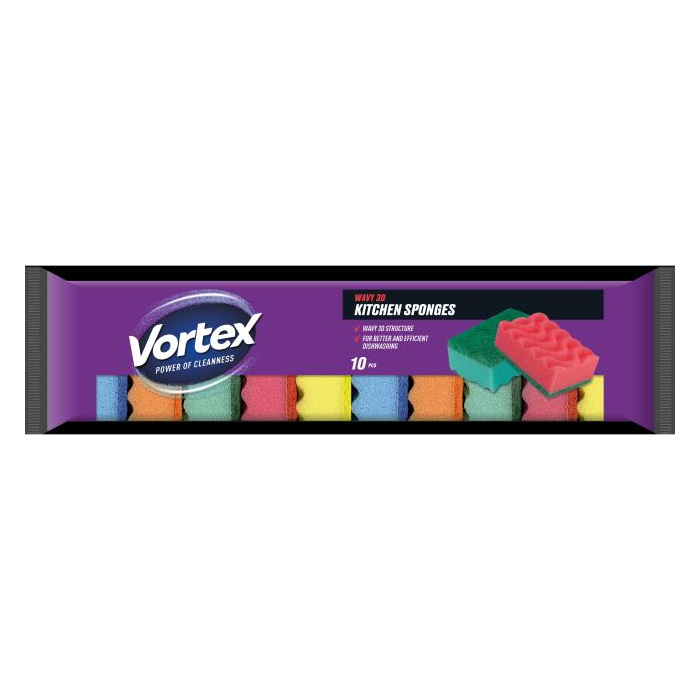 Vortex` štandardné kuchynské špongie - vlnité. Špeciálne abrazívne vlákno odstraňuje všetky druhy nečistôt. Majú jedinečný zvlnený povrch, ktorý poskytuje intenzívne čistiace vlastnosti a lepšiu penivosť, 10 ks.
