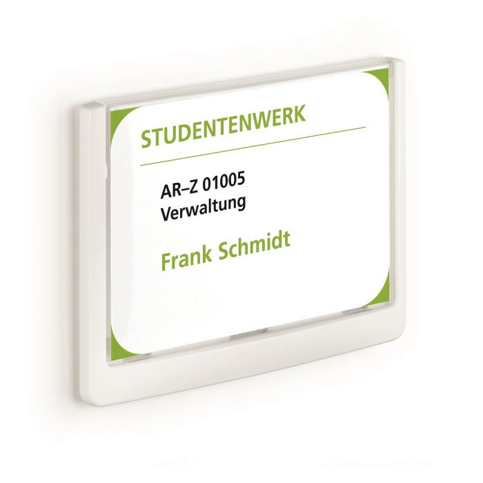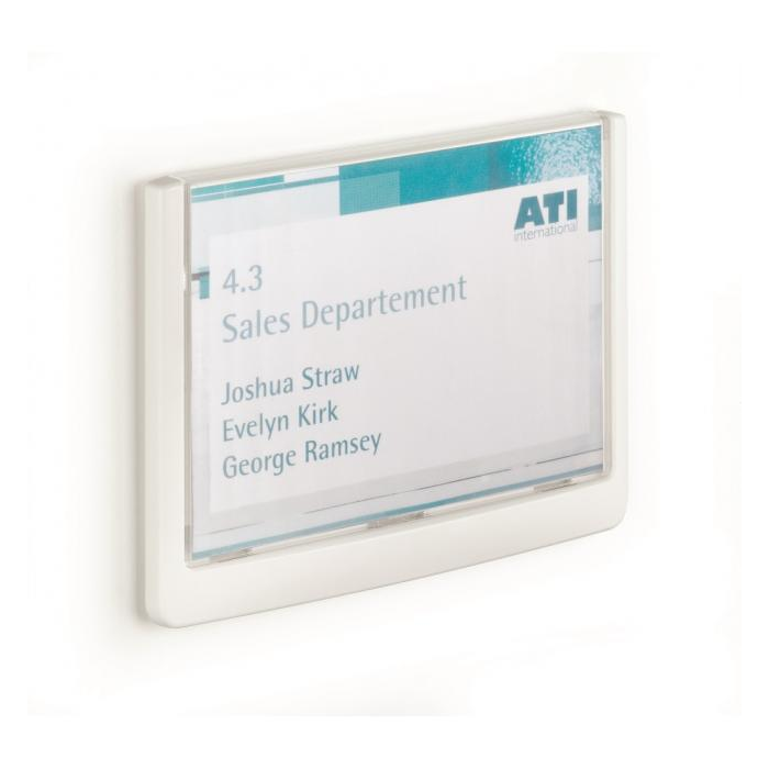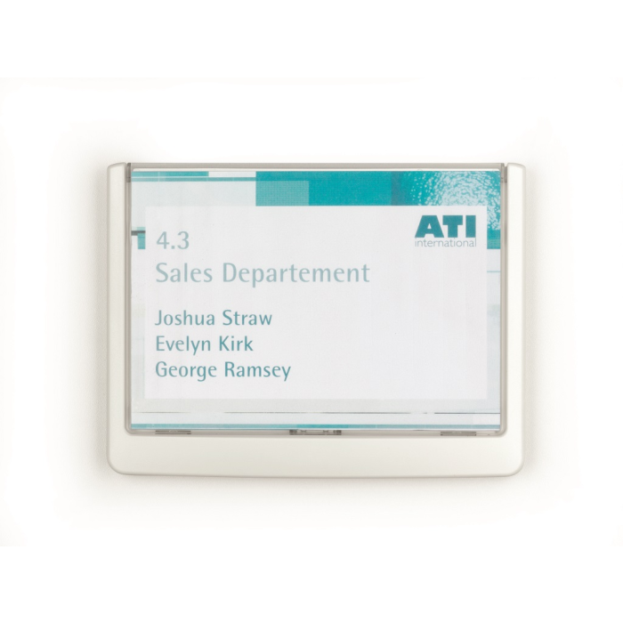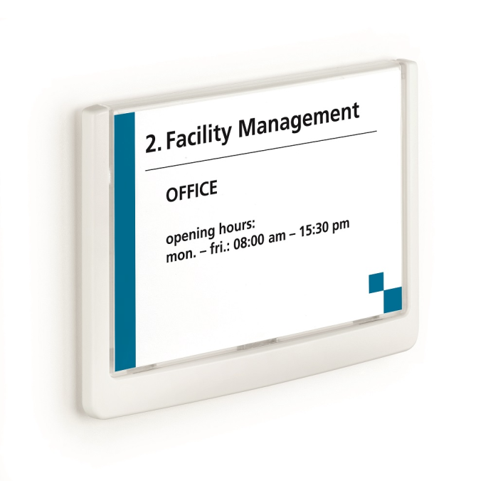 Moderná informačná tabuľka na dvere s lemom v atraktívnej bielej farbe. Predný panel sa otvára na jedno zatlačenie, a tým sa jednoducho sprístupnia vložené popisné papiere, ktoré sa môžu vymieňať podľa potrieb. Tabuľka je ideálna do kancelárií, úradov, škôl, univerzít a hotelov. Súčasťou balenia je montážna sada s názorným návodom. Namiesto pevného montovania môže byť tabuľka k povrchu aj prilepená.