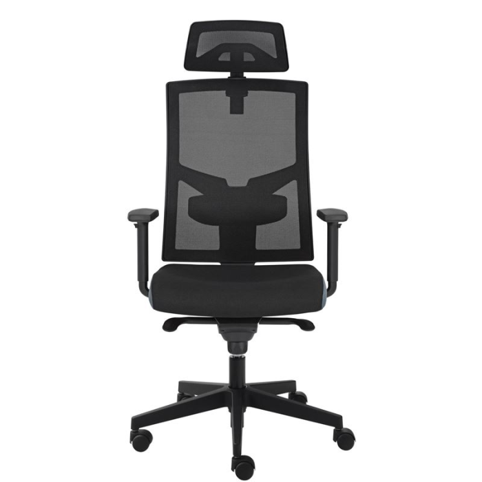 Kancelárska stolička vyššej kategórie z radu GAME s výškovo nastaviteľným čiernym sieťovaným operadlom s mechanickým zámkom a samostatne výškovo nastaviteľnou bedrovou opierkou.