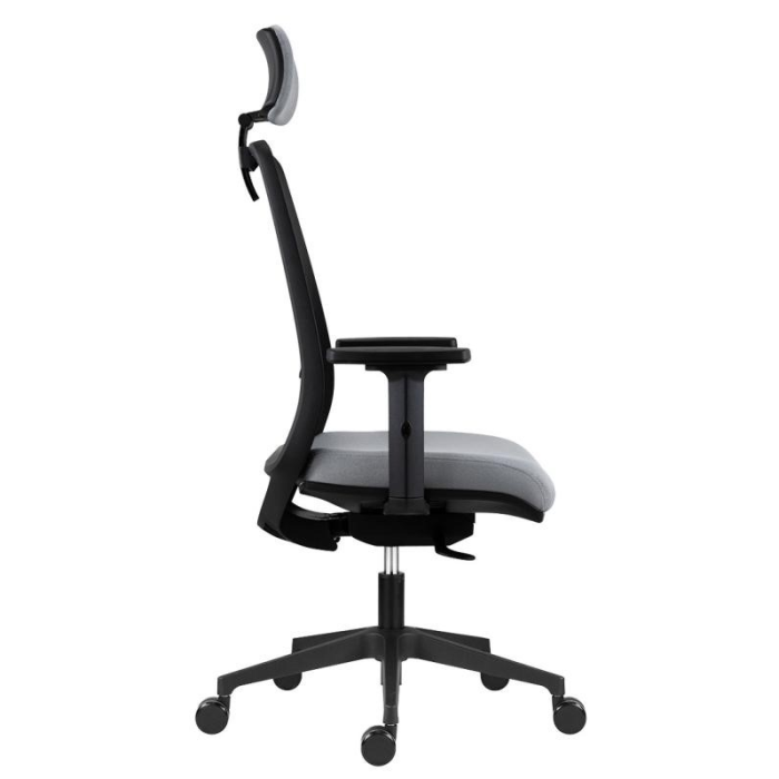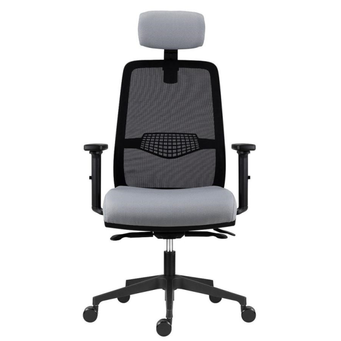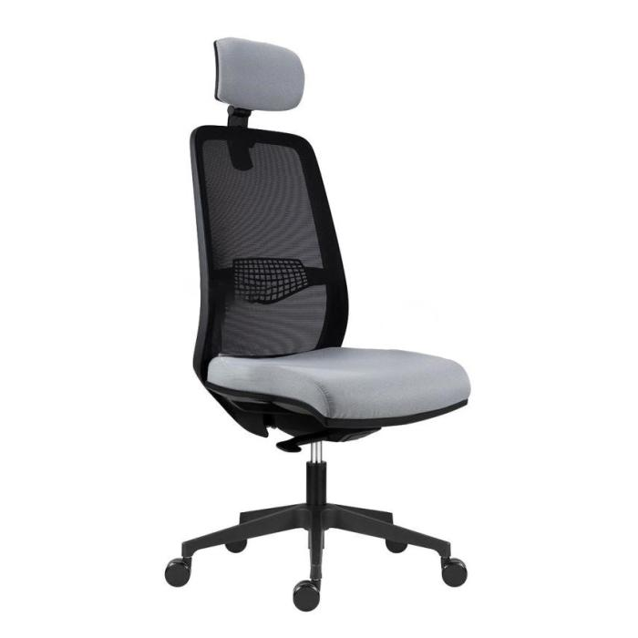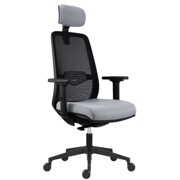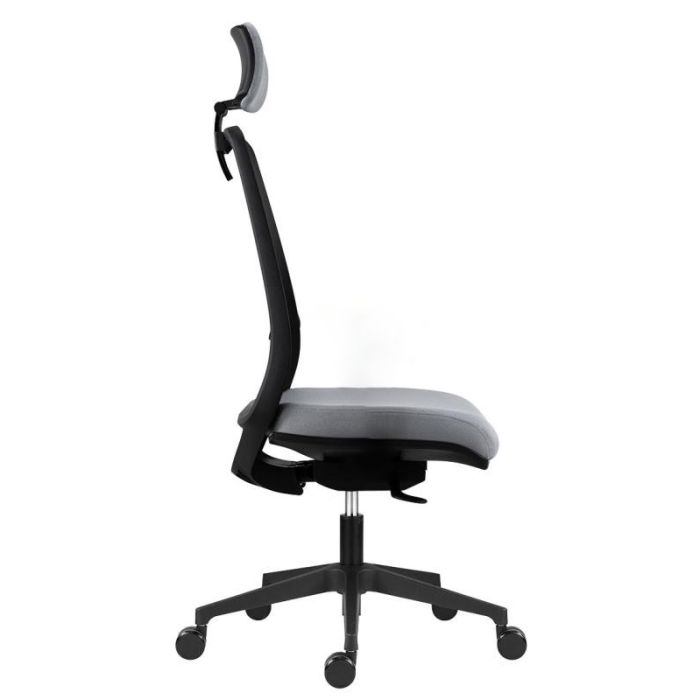 Kancelárska stolička Tullio s čiernou sieťovinou na operadle, podhlavníkom a nastaviteľnou bedrovou výstuhou, bez podrúčok.