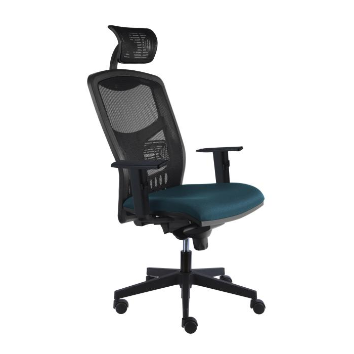 Moderná kancelárska stolička s vysokým fixným sieťovaným operadlom s výškovo nastaviteľnou bedrovou opierkou a s bohatým čalúnením sedadla.