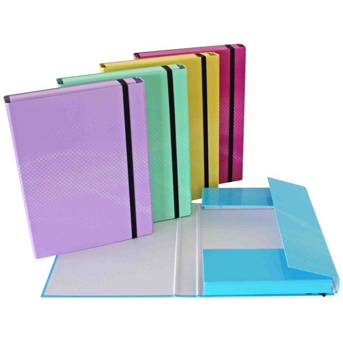 Kartónový box s gumičkou A4, rôznofarebný v 5 pastelových farbách, kartón s papierovou lamináciou, s 8 mm širokým, plochým elastickým uzáverom, 3 vnútorné chlopne, výška výplne cca 4 cm, Š x V x H: 24,0 x 4,0 x 32,0 cm.