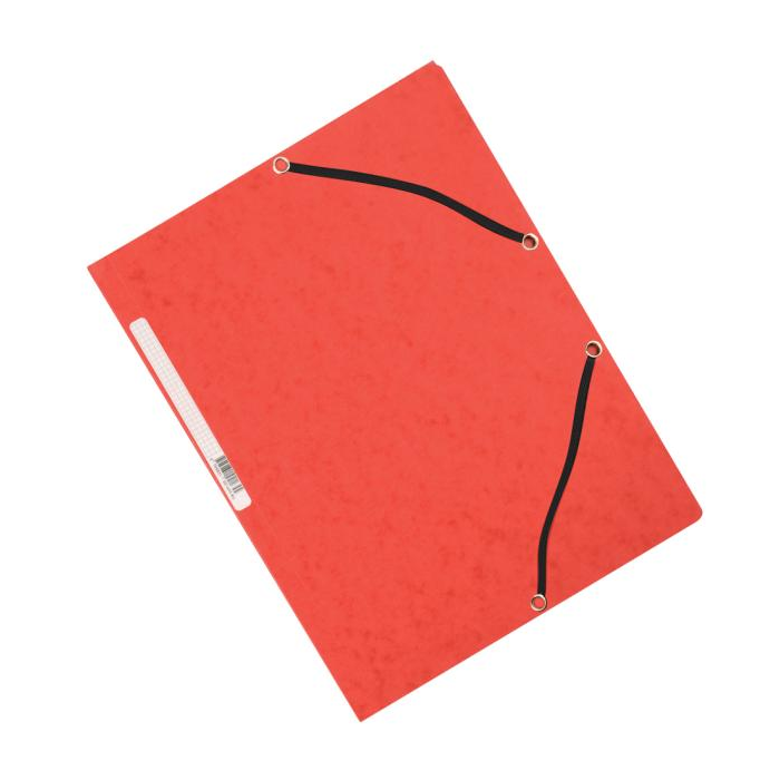 Obal s tromi chlopňami a gumičkou z kvalitného hladkého kartónu gramáže 375 g. Chrbtový štítok, kapacita 200 listov. Farba červená.