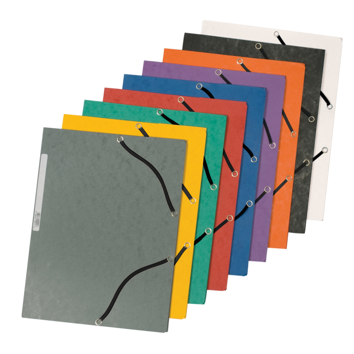 Obal s tromi chlopňami a gumičkou z kvalitného hladkého kartónu gramáže 375 g. Chrbtový štítok, kapacita 200 listov. Farba čierna.