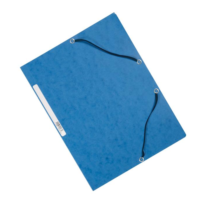 Obal s tromi chlopňami a gumičkou z kvalitného hladkého kartónu gramáže 375 g. Chrbtový štítok, kapacita 200 listov. Farba modrá.