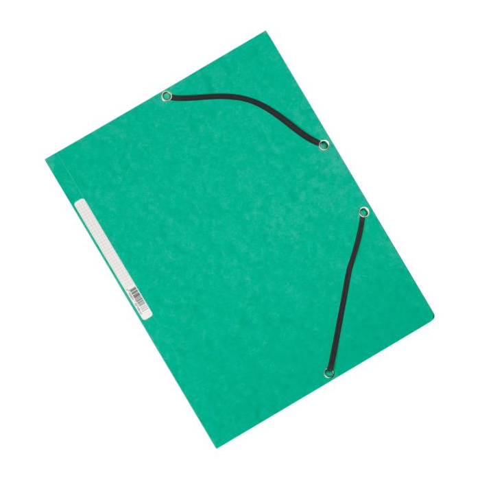Obal s tromi chlopňami a gumičkou z kvalitného hladkého kartónu gramáže 375 g. Chrbtový štítok, kapacita 200 listov. Farba zelená.
