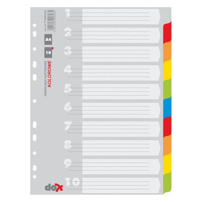 Celofarebný rozraďovač zo 175g kartónu bez popisu. Formát A4, eurodierovanie, titulná papierová strana určená k popisu jednotlivých oddielov. Balenie jedna sada v polyesterovom sáčku. Väčšie balenie 25 sád.