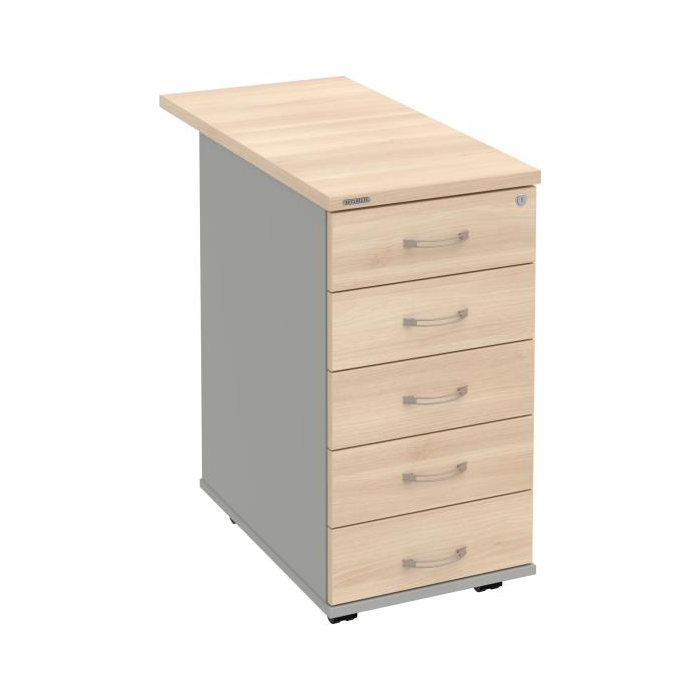 Kontajnery - všetko uložené a vždy poruke. Kontajnery sa väčšinou umiestňujú pod stoly. Mobilné modely sú vybavené kolieskami, je možné ich premiestniť podľa potreby. Základným materiálom korpusov je kvalitná laminovaná drevotriesková doska hrúbky 18 mm. Pre dlhšiu životnosť je na horný diel korpusu použitá doska, ktorej hrúbka je 25 mm. Korpusy a čelá zásuviek sú chránené proti poškodeniu hranou ABS 2 mm. Horná doska ma hĺbku 80 cm. Kontajnery sú vybavené zámkom s centrálnym zamykaním. Vďaka integrovanému systému STOP-CONTROL s centrálnym zámkom u väčšiny kontajnerov sa nemusíte báť prevrhnutiu kontajnera alebo prípadného privretia ruky. Systém zaručí, že pri otvorení jednej zásuvky sa ostatné zásuvky automaticky zablokujú. Zásuvky sú z plastu, ktorý je ľahko umývateľný a vhodný pre jednoduchú údržbu. Praktickou súčasťou vrchnej zásuvky je prehľadný organizér a priestorové deliace priečky. Vaše ceruzky, sponky a ďalšie kancelárske potreby budú vždy na poriadku. Organizér a deliace priečky sú súčasťou každého kontajnera. Na kontajnery Hobis sa vzťahuje päťročná záruka.