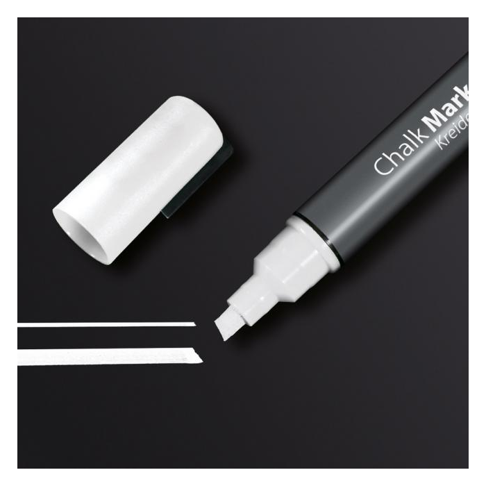 Ľahko stierateľné a vysoko nepriehľadné kriedové popisovače vhodné na sklenené tabule a všetky hladké povrchy podobné sklu. Zrezaný hrot hrúbky 1 - 5 mm. Vodeodolný atrament je zmazateľný vlhkou alebo suchou utierkou. Farba biela.