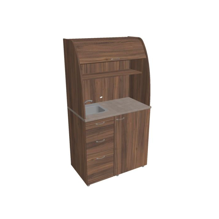 • Dve police vo vrchnej časti kuchynky poskytujú dostatočnú kapacitu na poháre, šálky a taniere. Na pracovnú dosku môžete umiestniť napr. kávovar a káblovou priechodkou v zadnej časti vyvediete kábel z priestoru kuchynky.