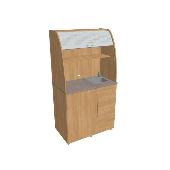 • Dve police vo vrchnej časti kuchynky poskytujú dostatočnú kapacitu na poháre, šálky a taniere. Na pracovnú dosku môžete umiestniť napr. kávovar a káblovou priechodkou v zadnej časti vyvediete kábel z priestoru kuchynky.
