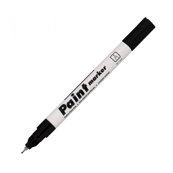 Lakový popisovač s plastovým hrotom v kovovej objímke píše na neporézne povrchy. Svetlostály atrament po zaschnutí odolá vode, poveternostným vplyvom aj oderu. Šírka stopy 0,7 mm. Väčšie balenie 10 ks v jednej farbe. Farba čierna.