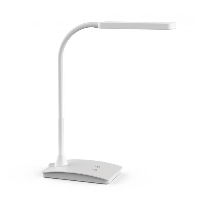 Výkonná kompaktná lampa energeticky úspornej triedy „A+“ (spektrá A++-E) s 24 LED žiarovkami bez možnosti ich výmeny so životnosťou 20 000 hodín, 8 LED s denným bielym svetlom 3 000 °K, 16 LED s 6 500 °K. Teplotu farieb a intenzitu osvetlenia je možné nastaviť v 3 krokoch v závislosti od denného času a osobných potrieb. Svietivosť 1 360 lx pri vzdialenosti 35 cm od stola, svetelný tok 320 lúmenov, extrémne nízka spotreba energie cca 6 kWh / 1 000 h. Stabilné kovové rameno s gumovým povrchom a fl exibilným rozsahom pre nastavenie uhla, sklopná a otočná plastová svetelná hlavica 16 × 6 cm. Výška normálnej pracovnej pozície 36 cm. Pohodlné ovládacie tlačidlá s dotykovou funkciou na plastovej základni rozmerov 16,5 × 10,6 cm so závažím a podložkou proti poškodeniu dosky stola. Dĺžka kábla 1,7 m. Farba biela.