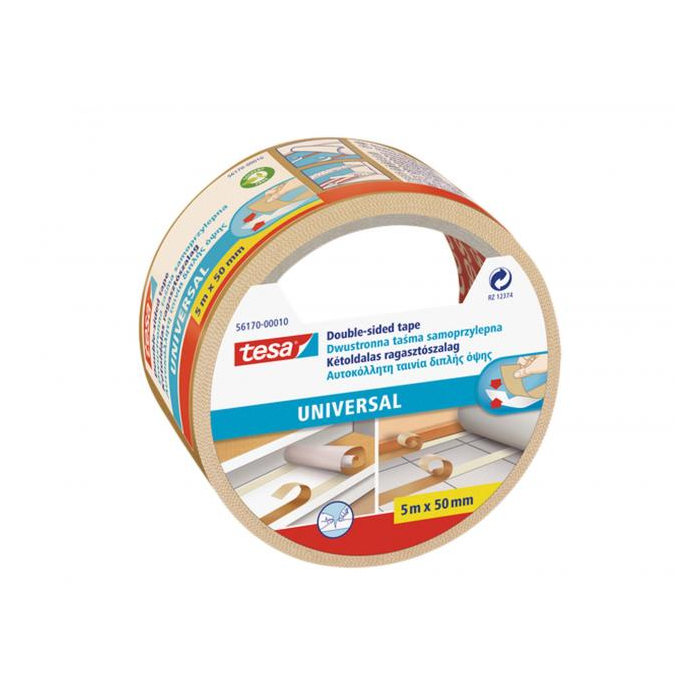 Univerzálna obojstranná páska ideálna na koberce a trvalé spojenie rôznych materiálov, na ručné práce a dekorácie. Rozmery 50 mm × 5 m.