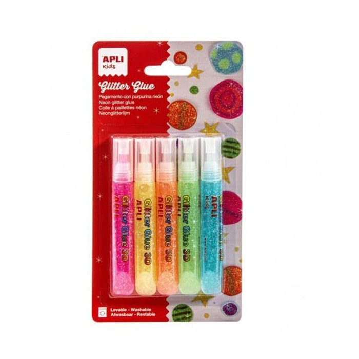Glitrové lepidlo v rôznych neónových farbách: fuchsiová, žltá, oranžová, zelená a modrá. Balenie obsahuje 5 injekčných liekoviek, jednu na farbu, každá po 13 g. Produkt sa ľahko používa vďaka flexibilnej fľaštičke a dávkovacej špičke, ktorá umožňuje presnejšiu aplikáciu. Ideálne na lepenie alebo zdobenie: naneste priamo na povrch, ktorý chcete ozdobiť a nechajte na vzduchu sušiť aspoň 30 minút. Odporúča sa na rôzne typy povrchov: papier, kartón, EVA pena, sklo, plast, textil, drevo alebo keramika. Veľmi čistý produkt, možno prať v práčke v programoch teplej vody