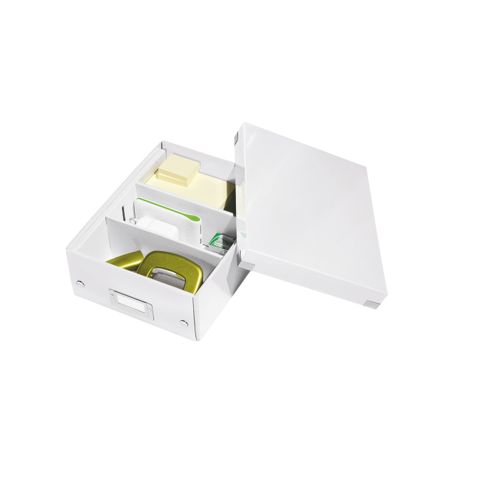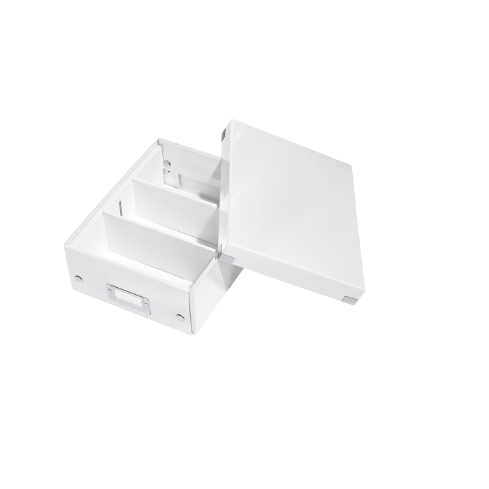 Malá štýlová skladacia krabica s vekom a s rámčekom na štítok. Na usporiadanie nabíjačiek, káblov a ďalšieho vybavenia kancelárie. Veľkosť S. Na prvý pohľad vidíte, čo sa vojde dovnútra! Výška krabice bola navrhnutá tak, aby vám poskytla dostatok priestoru na uloženie príslušenstva a zároveň zabránila skladaniu vecí na seba. Na vylepšenie usporiadania obsahu krabice použite priložený vnútorný systém priehradiek. Môžete rozdeliť krabicu na 2 alebo 3 časti a zabrániť tak miešaniu káblov alebo fotiek. Inteligentná skladacia konštrukcia: rýchle a jednoduché zloženie bez nutnosti použitia skrutiek a možnosť opätovného rozloženia na úsporu miesta, keď krabicu práve nepotrebujete. Moderný vzhľad a farby na skrášlenie vašej kancelárie alebo domova. Lesklé vyhotovenie vytvára prvotriedny vzhľad a umožňuje dlhodobé používanie a jednoduché utieranie prachu. Rámček na štítok pre jednoduché označenie obsahu. Materiál pevný kartón potiahnutý polaminovaným papierom. Farba biela.