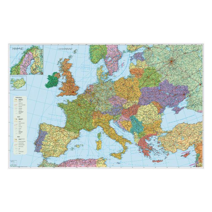 Nástenná mapa Európa - cestná sieť. Na mape je vyznačené aktuálne rozdelenie Európy a cestná sieť. Je vhodná na trvalé vyvesnie. Je obojstranne laminovaná, dodávaná s bielymi lištami s úchytom na zavesenie.
