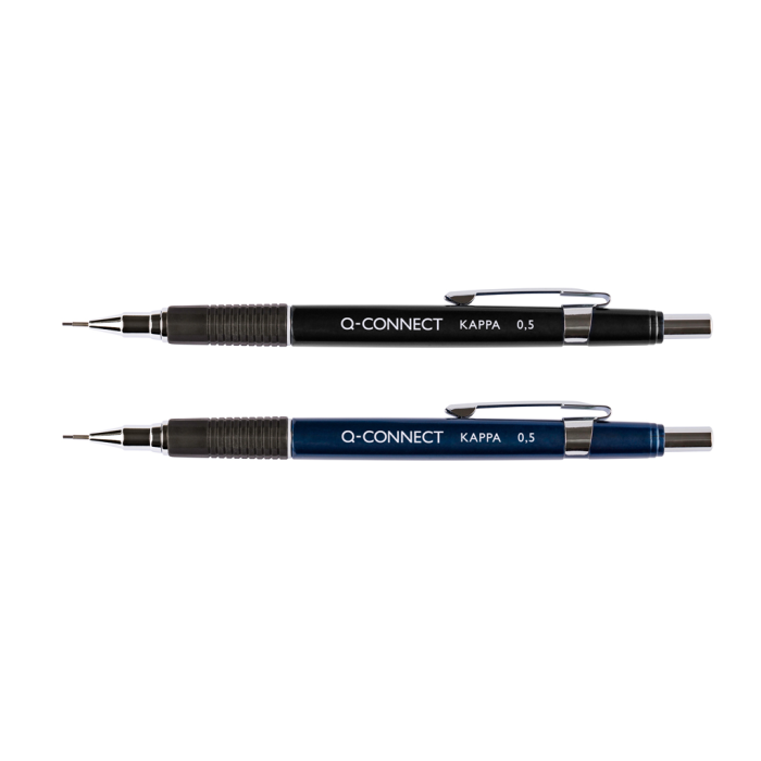 Plastová mikroceruzka s kovovou špičkou, výsuvnou vodiacou trubičkou vedenia tuhy a gumou pod stláčacím uzáverom. Hrúbka 0,5 mm, dodávané v mixe farieb bez možnosti výberu. Väčšie balenie 12 kusov (6 čiernych/6 modrých). Náhradná náplň obj. kód QC001547.