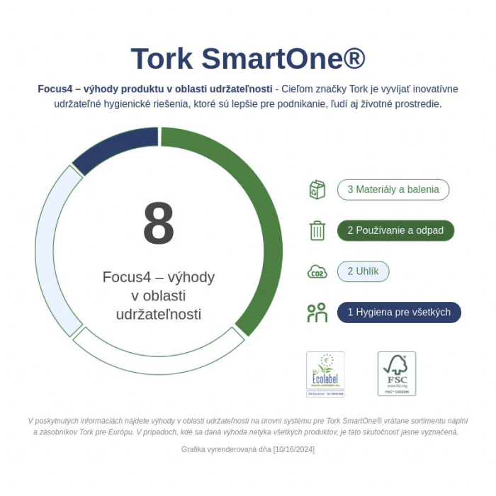 Tork SmartOne® mini zásobník na toaletný papier v dizajne Elevation je moderný a efektívny systém zásobníkov vhodný pre toalety a umyvárne s nízkou až strednou návštevnosťou, kde je požadovaná vyššia odolnosť. Dávkovanie po útržkoch pomáha znižovať spotrebu až o 40 % v porovnaní s tradičnými jumbo kotúčovými zásobníkmi, čo znamená viac návštev na jeden kotúč. Zásobníky Tork Elevation majú praktický a moderný dizajn, ktorý zanecháva v hosťoch dlhodobý dojem.