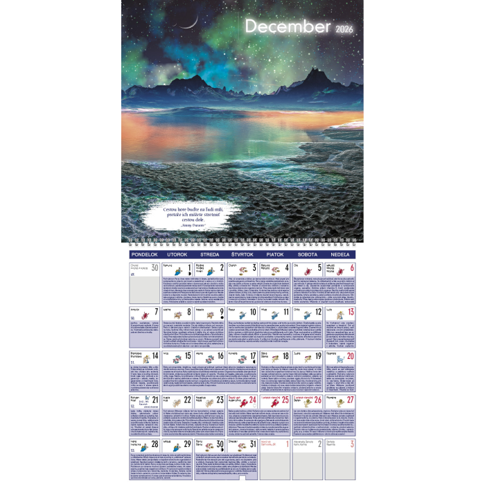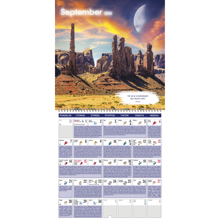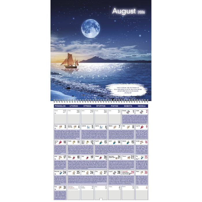 Tento kalendár ponúka praktické rady pre každý deň, ktoré sa riadia podľa fáz Mesiaca. Dozviete sa, kedy je vhodný čas na odpočinok, aktivitu, rozhodovanie či starostlivosť o telo a dušu. Každá fáza prináša odporúčania, čo robiť a čomu sa radšej vyhnúť. Silné fotografie a inšpiratívne citáty dodávajú kalendáru výnimočnú atmosféru.